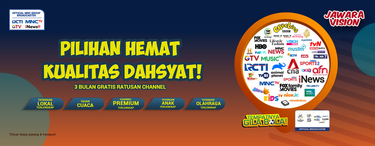 Jawara Vision merupakan paket yang menjual perangkat (dekoder) dan tayangan Free- to-Air (FTA) dari MNC Vision berupa tayangan lokal dan internasional tanpa batas waktu! Kamu yang memilih Jawara Vision akan dapat GRATIS RATUSAN CHANNEL selama 3 bulan dan GRATIS MNC Channels selama 1 tahun! Udah gitu, GRATIS biaya pasang juga lho.